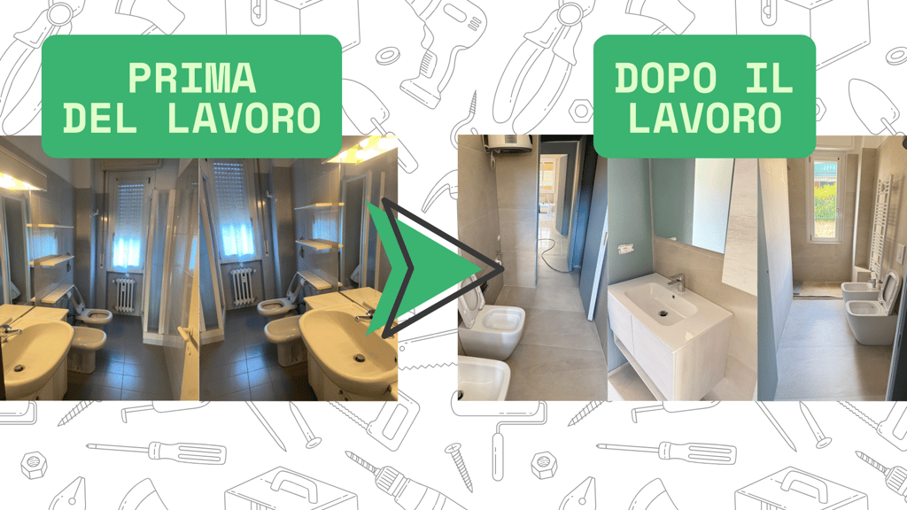 Del bagno di cui ho raccontato, grazie al mio cliente, voglio pubblicare delle foto. Non sono delle foto perfette, non le abbiamo scattate con l’intento di pubblicarle ma spero che suggeriscano lo stesso il lavoro eseguito. È un bagno di cui ho realizzato: demolizione vecchi sanitari, box doccia, lavandino, piastrelle, pavimento, sottofondo; realizzazione nuovi impianti idrico e elettrico, con installazione di scaldabagno ibrido; realizzazione attacco lavatrice; piastrellatura; posa nuovi sanitari filo muro; piatto doccia filo pavimento; lavandino stuccatura e imbiancatura; realizzazione dell’antibagno con porta raso muro.